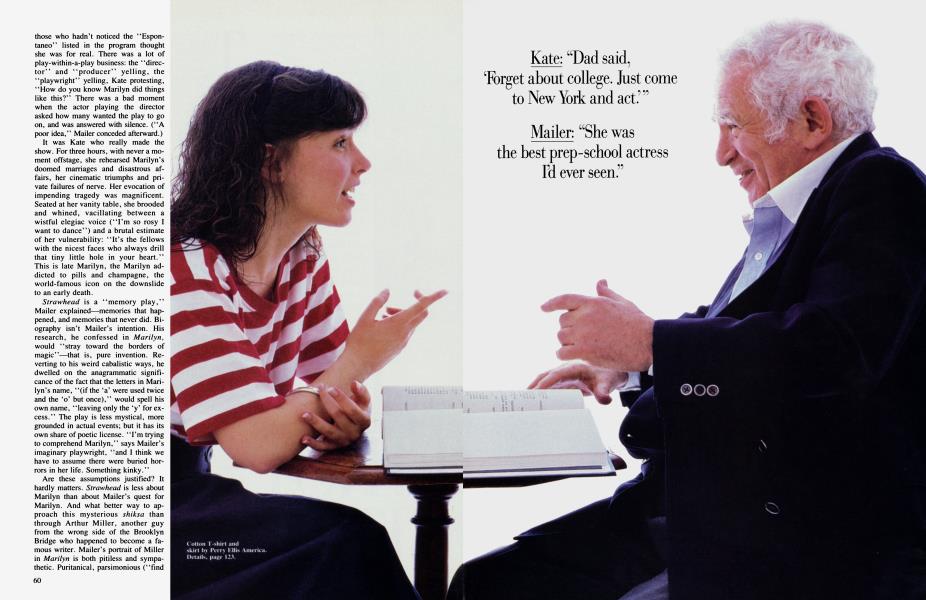 Mailer’s new Marilyn is his daughter: Kate, born in 1962, two weeks after Monroe died. He cast her in his Actors Studio production of Strawhead, which dramatizes his continuing obsession with the sex goddess. Kate was so extraordinary we set up a photo session with BERT STERN, the photographer who captured the real Marilyn in that haunting pictorial document The Last Sitting. Sterns verdict: “No one has played Marilyn better, except Marilyn.” On subsequent pages, NORMAN MAILER offers an exclusive extract from his play