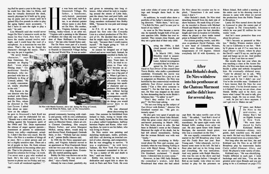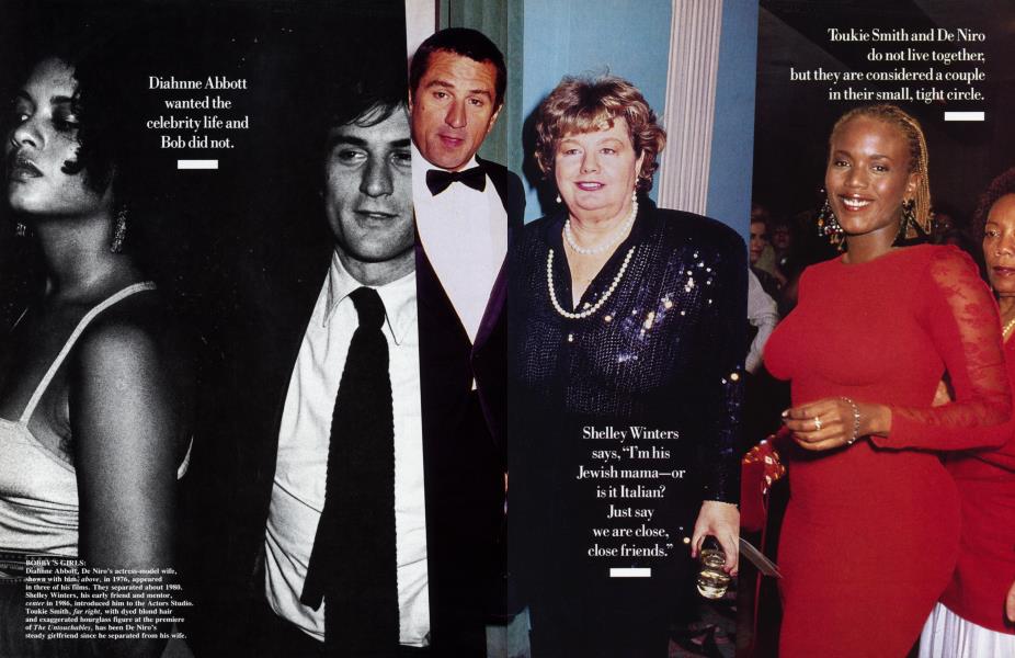 De Niro holds back. He is a deeply private person who rarely shows emotion. Shelley Winters recalls once when he did. "At a party I gave for my theatrical waifs—my babies—Bobby was there waiting for some girl he had a crush on. She didn't arrive until dessert was put on—she had totally forgotten she was supposed to meet him. He walked into my bedroom and pounded the headboard with his fist."