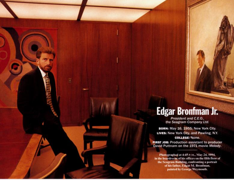 Photographed at 4:45 P.M., May 24, 1994, in the boardroom of his offices on the fifth floor of the Seagram Building, confronting a portrait of his father, Edgar M. Bronfman, painted by George Weymouth.