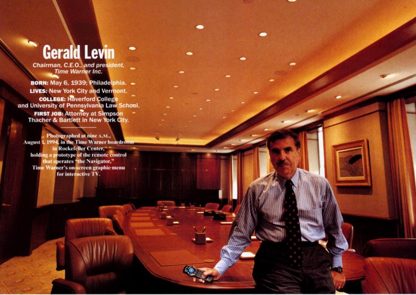 Photographed at nine A.M., August 1, 1994, in the Time Warner boardroom in Rockefeller Center, holding a prototype of the remote control that operates "the Navigator," Time Warner's on-screen graphic menu for interactive TV.