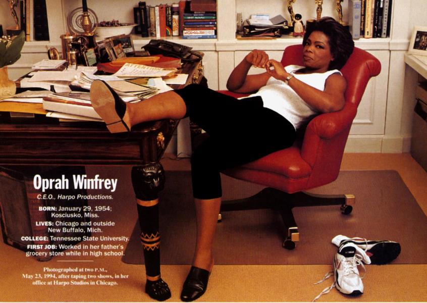 Photographed at two P.M., May 23, 1994, after taping two shows, in her office at Harpo Studios in Chicago.