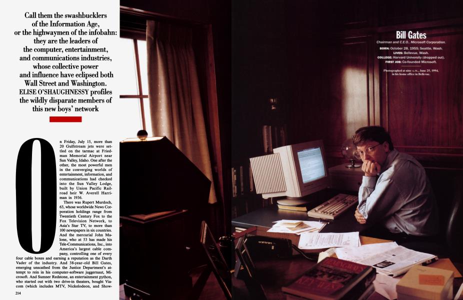 October 1994 Elise O'Shaughnessy Annie LeibovitzCall them the swashbucklers of the Information Age, or the highwaymen of the infobahn: they are the leaders of the computer, entertainment, and communications industries, whose collective power and influence have eclipsed both Wall Street and Washington. ELISE O'SHAUGHNESSY profiles the wildly disparate members of this new boys' network
