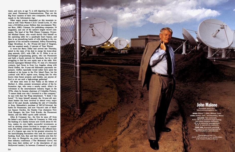 There was Rupert Murdoch, 63, whose worldwide News Corporation holdings range from Twentieth Century Fox to the Fox Television Network, to Asia's Star TV, to more than 100 newspapers in six countries. And the mercurial John Malone, who at 53 has made his Tele-Communications, Inc., into America's largest cable company, controlling one of every four cable boxes and earning a reputation as the Darth Vader of the industry. And 38-year-old Bill Gates, emerging unscathed from the Justice Department's attempt to rein in his computer-software juggernaut, Microsoft. And Sumner Redstone, an entertainment python, who started out with two drive-in theaters, bought Viacom (which includes MTV, Nickelodeon, and Showtime), and now, at age 71, is still digesting his most recent meal, Paramount Communications. They are the Big Four—masters of their own companies, first among equals in the Information Age.