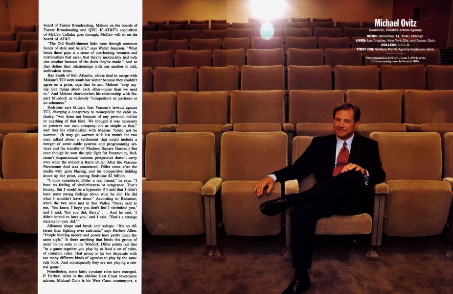 A worn-out Barry Diller had arrived late Thursday, mired in the ruins of his deal to merge his home-shopping network, QVC, with CBS. At 52, Diller is an acknowledged programming genius, who ran Paramount and built a fourth network for Murdoch, but he is still struggling to find his own equity seat at the table. Hollywood superagent Michael Ovitz, 47, man of a thousand contacts, had flown in from Los Angeles, along with David Geffen, the 51-year-old billionaire pop-music impresario. Geffen reportedly would rather have spent the weekend at his house in the Fire Island Pines, but his contract with MCA expires soon, freeing him for who knows what future projects—and besides, can anyone afford to sit out such a high-wattage gathering?