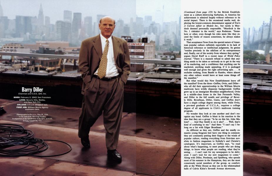 The touchstone of Old Establishment power, for men such as John McCloy, was that their names rarely appeared in the newspapers. The 80s changed all that, as the fevered drama of mergers and acquisitions turned the financial pages into a real-life version of Dynasty. Today, surfing the publicity wave is a virtual necessity. For Diller or Ovitz or Geffen or Eisner, hyping or controlling their images is almost second nature; it is, ultimately, their profession. Others, such as Murdoch and Levin and Malone, rarely talk to the press. But all of them must deal with the power of myth and media— a power that, in one way or another, they have helped unleash.