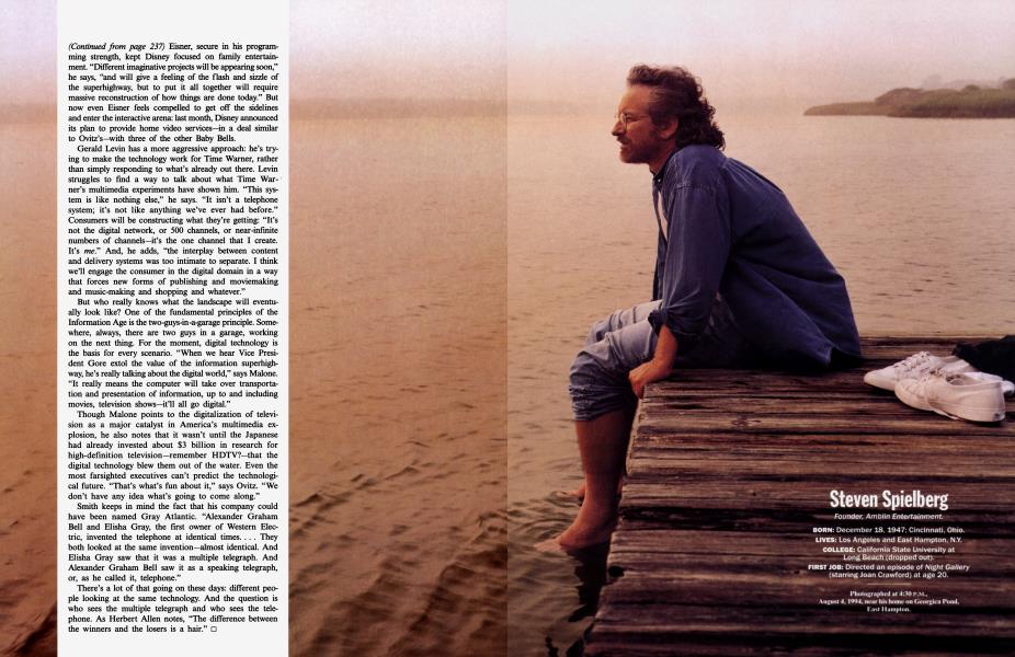 But who really knows what the landscape will eventually look like? One of the fundamental principles of the Information Age is the two-guys-in-a-garage principle. Somewhere, always, there are two guys in a garage, working on the next thing. For the moment, digital technology is the basis for every scenario. "When we hear Vice President Gore extol the value of the information superhighway, he's really talking about the digital world," says Malone. "It really means the computer will take over transportation and presentation of information, up to and including movies, television shows—it'll all go digital."
