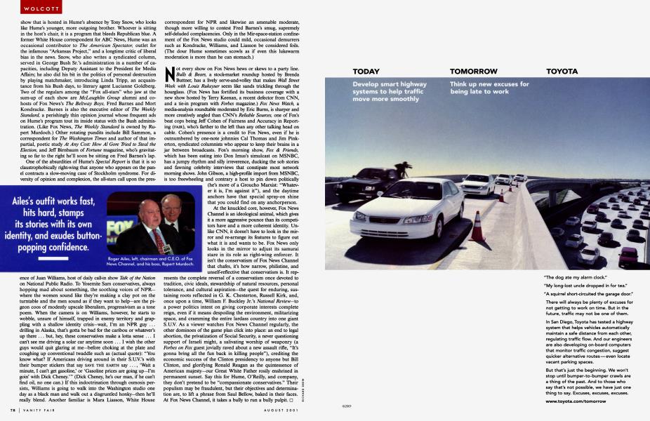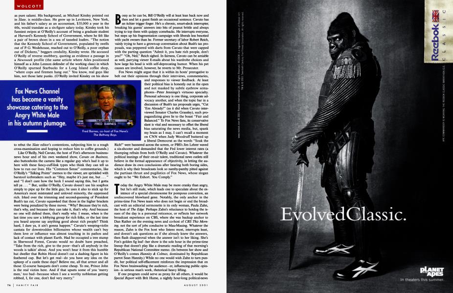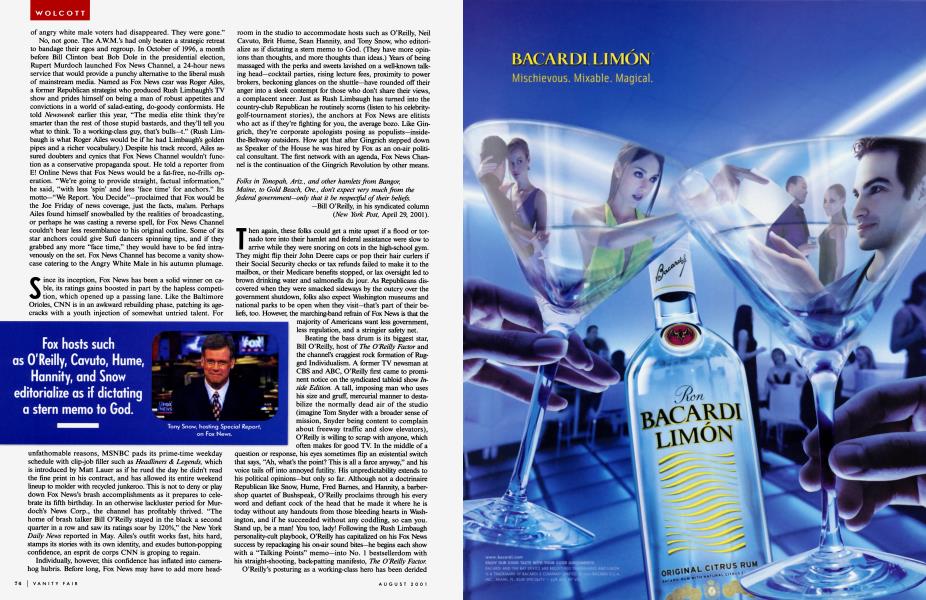 August 2001 James WolcottFive years ago, Rupert Murdoch’s Fox News Channel was launched as an anti-Establishment antidote to the mainstream media’s perceived liberal bias. Instead, its blowhard anchors—Bill O'Reilly, Neil Cavuto, Brit Hume, et al.—cater to the Angry White Male, spewing a conservatism that is fundamentally elitist