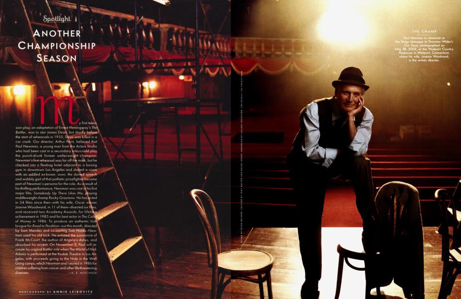 My first television play, an adaptation of Ernest Hemingway's The Battler, was to star James Dean, but shortly before the start of rehearsals in 1955, Dean was killed in a car crash. Our director, Arthur Penn, believed that Paul Newman, a young man from the Actors Studio who had been cast in a secondary role, could play the punch-drunk former welterweight champion. Newman's first rehearsal was far off the mark, but he checked into a fleabag hotel adjacent to a boxing gym in downtown Los Angeles and shared a room with an addled ex-boxer; soon, the slurred speech and wobbly gait of that pathetic prizefighter became part of Newman's persona for the role. As a result of his thrilling performance, Newman was cast in his first major film, Somebody Up There Likes Me, playing middleweight champ Rocky Graziano. He has in 54 films since then—with his wife, Oscar Joanne Woodward, in 11 of them—directed six and received two Academy Awards, for lifetime achievement in 1985 and for best actor in The of Money in 1986. To produce an authentic Iris brogue for Road to Perdition—out this month, directed by Sam Mendes and co-starring Tom Hanks-Newman used his old trick. He enlisted the assistance of Frank McCourt, the author of Angela's Ashes, and absorbed his accent. On November 5, Paul will recreate his original Battler role when The World of Nick Adams is performed at the Kodak Theatre in Los Angeles, with proceeds going to the Hole in the Wall Gang camps, which Newman and I started in 1986 for children suffering from cancer and other life-threatening diseases.