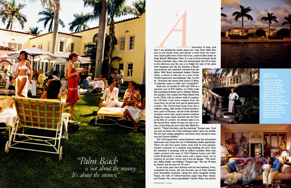'A thousand in help, and here I am picking the runner grass out," says Terry Allen Kramer as she bends down and plucks a weed from the otherwise impeccable lawn of her four-acre, ocean-to-lake estate on Palm Beach's Billionaires' Row. It is one of those heavenly South Florida midwinter days, when the thermometer hits 80 at three in the afternoon and the sun is so bright the tops of the palm trees the sky. Kramer, a Broadway producer who inherited a fortune from her father, Wall Street investment banker Charles Allen, is about to take me on a tour of her 44,000-square-foot neo-Italianate villa, La Follia. "Everyone else names their house Le Rêve, La Sérénité—mine is a folly. Isn't it beautiful?"