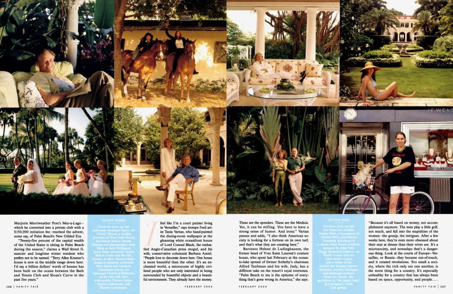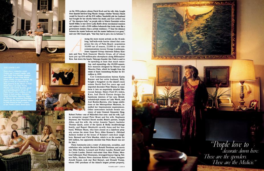 In the last decade, Palm Beach has seen an influx of big new money unprecedented even for a resort founded as a playground for the super-rich—and there appears to be no end in sight, even in this time of economic uncertainty and international tension. In fact, while I was researching this story, war with Saddam Hussein seemed all but inevitable, yet the conversation at the dinner parties I attended—and I went to 14 in as many nights—centered on such topics as the fabulous job the Parisian decorator Alberto Pinto did on the 1920s palazzo oilman David Koch and his wife, Julia, bought from Spanish fast-food king Placido Arango; whether Veronica Hearst would be forced to sell the $30 million Vanderbilt pile her husband had bought for her shortly before his death; and how awful it was of "the shampoo lady," as people refer to Matrix Essentials widow Sydell Miller, to tear down Lydia Buhi's divine neoclassical mansion and replace it with a $100 million behemoth that looks more like a government ministry than a private residence. ("I hear the distance between the master bedroom and the master bathroom is so great," said one Old Guard gent, "that they had to put a loo in between.")