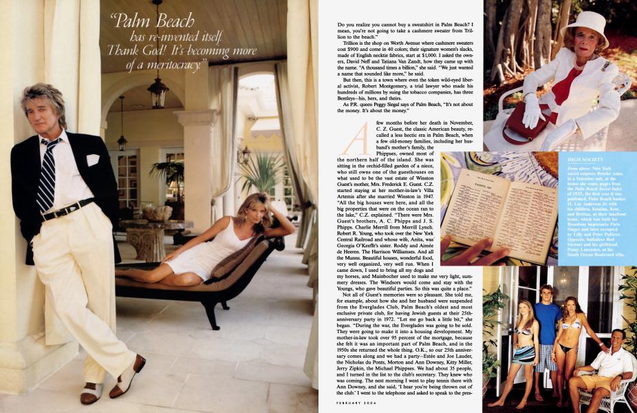 A few months before her death in November, C. Z. Guest, the classic American beauty, recalled a less hectic era in Palm Beach, when a few old-money families, including her husband's mother's family, the Phippses, owned most of the northern half of the island. She was sitting in the orchid-filled garden of a niece, who still owns one of the guesthouses on what used to be the vast estate of Winston Guest's mother, Mrs. Frederick E. Guest. C.Z. started staying at her mother-in-laws Villa Artemis after she married Winston in 1947. "All the big houses were here, and all the big properties that were on the ocean ran to the lake," C.Z. explained. "There were Mrs. Guest's brothers, A. C. Phipps and J. S. Phipps. Charlie Merrill from Merrill Lynch. Robert R. Young, who took over the New York Central Railroad and whose wife, Anita, was Georgia O'Keeffe's sister. Roddy and Aimée de Heeren. The Harrison Williamses. And all the Munns. Beautiful houses, wonderful food, very well organized, very well run. When I came down, I used to bring all my dogs and my horses, and Mainbocher used to make me very light, summery dresses. The Windsors would come and stay with the Youngs, who gave beautiful parties. So this was quite a place."