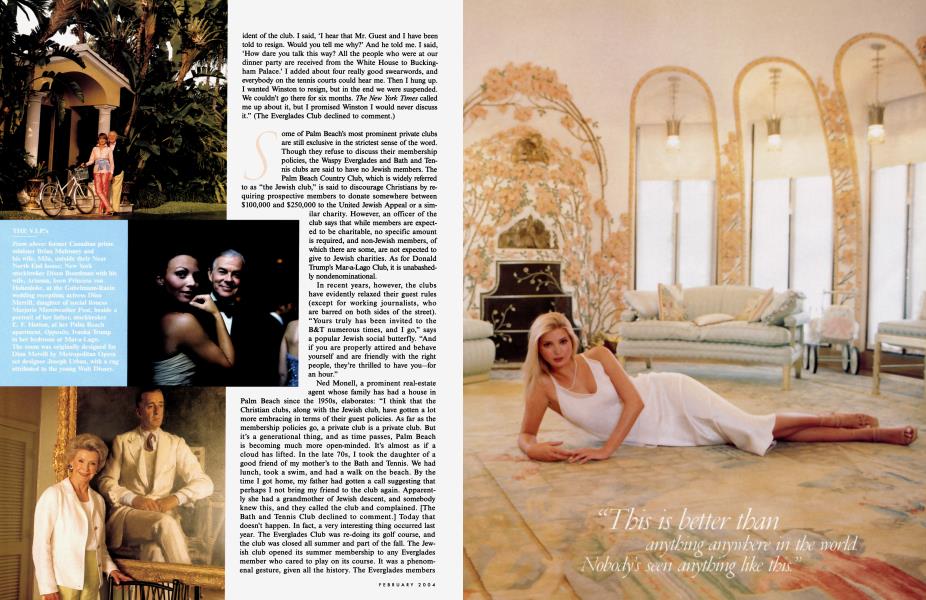Ned Monell, a prominent real-estate agent whose family has had a house in Palm Beach since the 1950s, elaborates: "I think that the Christian clubs, along with the Jewish club, have gotten a lot more embracing in terms of their guest policies. As far as the membership policies go, a private club is a private club. But it's a generational thing, and as time passes, Palm Beach is becoming much more open-minded. It's almost as if a cloud has lifted. In the late 70s, I took the daughter of a good friend of my mother's to the Bath and Tennis. We had lunch, took a swim, and had a walk on the beach. By the time I got home, my father had gotten a call suggesting that perhaps I not bring my friend to the club again. Apparently she had a grandmother of Jewish descent, and somebody knew this, and they called the club and complained. [The Bath and Tennis Club declined to comment.] Today that doesn't happen. In fact, a very interesting thing occurred last year. The Everglades Club was re-doing its golf course, and the club was closed all summer and part of the fall. The Jewish club opened its summer membership to any Everglades member who cared to play on its course. It was a phenomenal gesture, given all the history. The Everglades members were eternally grateful, and that went a hundred miles in terms of opening people's eyes."