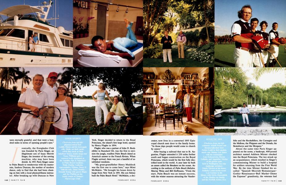 Nobody sought the limelight more than Stanley and Bea Tollman, who bought a lakefront villa built in the 30s for John A. Vietor, the Jell-O heir. The Tollmans were from South Africa, and their money came from hotels, including the Days Inn chain. They restored the Chesterfield Hotel and made its Leopard Lounge the place to go for drinks and dancing. Their New Year's Eve party soon eclipsed even that given by the Coconuts, which had been started in the 30s by a group of old-money bachelors as a way to pay back the hostesses who had entertained them all season. "People would give their eyeteeth to be invited to the Tollmans' party," says longtime man-about-town Lou Gartner. "They never had more than 200, and every year was a different theme. One year it was the circus; the last one was a night in old Havana. The centerpieces were live girls, wearing just little things on the bottom, with their heads turned into chandeliers. They were just there when you came in. They got down when we sat down to eat." Then, in April 2002, Stanley Tollman and four associates were indicted on tax-fraud and conspiracy charges for allegedly tricking six banks and an investment firm out of $42.6 million. The couple fled to London, and when their name comes up in Palm Beach, the subject is quickly changed.