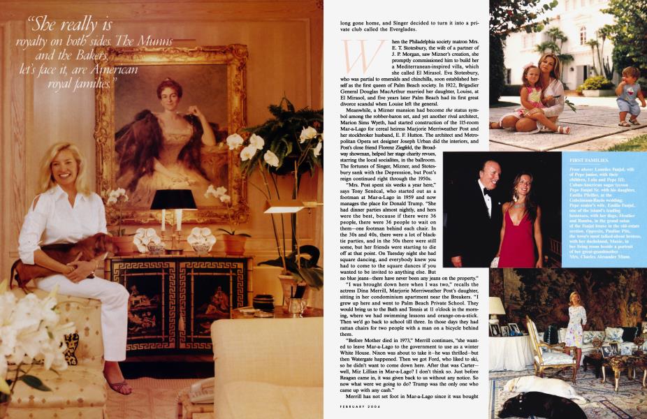 Among this tight-knit group, the new star is Julia Koch, the onetime Adolfo assistant married to David Koch, the Kansas billionaire who with his brother Charles runs the second-largest privately owned company in the country. The Kochs began their social ascent when they purchased Jackie Onassis's Fifth Avenue apartment. Their Palm Beach house is a Mizner original, with extensions by Maurice Fatio and Joseph Urban. The first thing one sees, driving through the gates, is a huge Henry Moore sculpture, and there are comparable treasures in almost every room. The salon is dominated by a pair of 19th-century French mosaic copies of Tiepolo frescoes of Antony and Cleopatra. The walls of the master bedroom are inlaid with mother-of-pearl medallions, and the bed is covered in white tulle embroidered with silver sequins. "It's so nice to see so much money so well spent," says the Kochs' close friend Betsy Kaiser. Also of note: David Koch is probably the only Palm Beach resident who belongs to the Everglades, the Palm Beach Country Club, and the brand-new Trump International Golf Club near the airport.