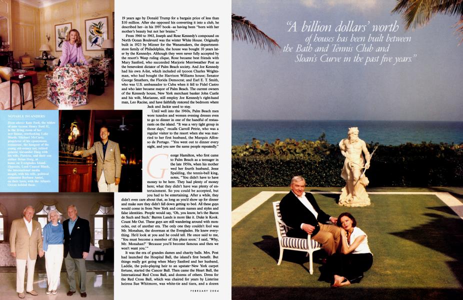 George Hamilton, who first came to Palm Beach as a teenager in the late 1950s, when his mother wed her fourth husband, Jesse Spalding, the tennis-ball king, notes, "You didn't have to have money to be here. They had plenty of money here; what they didn't have was plenty of entertainment. So you could be accepted, but you had to be entertaining. After a while, they didn't even about that, as long as you'd show up for dinner and make sure they didn't fall down getting to bed. All these guys would come in from New York and create names and styles and false identities. People would say, 'Oh, you know, he's the Baron de Such and Such.' Barren Lands is more like it. Duke Ie Kook. Count Me Out. These guys are still wandering around with monocles, out of another era. The only one they couldn't fool was Mr. Monahan, the doorman at the Everglades. He knew everything. He'd look at you and he could tell. He once said to me, 'You must some a member of this place soon.' I said, 'Why, Mr. Monahan?" 'Because you'll become famous and then we won't want you.'"