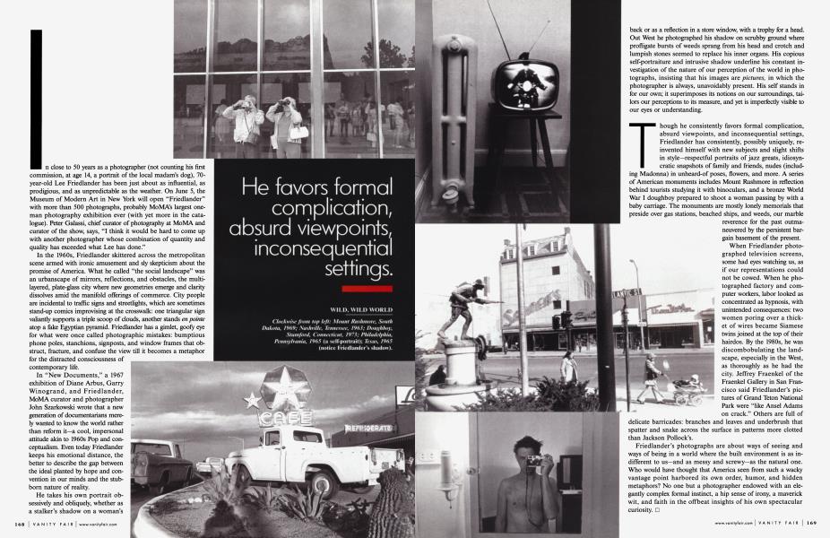 Portraits, cityscapes, nudes, nature—for almost half a century, Lee Friedlander has brought his witty, skeptical, investigative eye to every aspect of the American scene, capturing the divide between expectation and reality. As the Museum of Modern Art opens what is perhaps its largest-ever one-man photography exhibition, VICKI GOLDBERG explores the quirky, unexpected power of Friedlander's perceptions