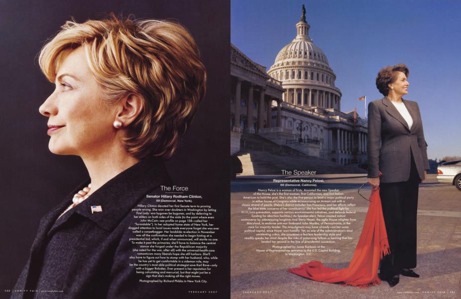 Nancy Pelosi is a woman of firsts. Anointed the new Speaker of the House, she's the first woman, first Californian, and first Italian-American to hold the post. She's also the first person to lead a major political party in either house of Congress while accessorizing an Armani suit with a classic strand of pearls. (Pelosi's district includes San Francisco, and her efforts reflect the blue-state concerns of her constituency: she has led the political fight for H.I.V./AIDS prevention, supports various environmental initiatives, and defends federal funding for abortion facilities.) As Speaker-elect, Pelosi created instant controversy by sidestepping longtime rival Steny Hoyer, the agile House infighter from Maryland, to endorse anti-war firebrand John Murtha, of Pennsylvania, in the race for majority leader. The misjudgment may have already cost her some political capital, since Hoyer won handily. Yet, as one of the administration's most unrelenting critics, she possesses a fearless leadership style and readily speaks her mind despite the risks of polarizing fallout—a bearing that has landed her second in the line of presidential succession.