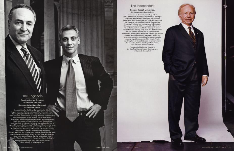Immediately after the November election, the debate began: who were the true architects of the Democratic victory that swept Capitol Hill? By most accounts, top honors went to these two brash electoral Jedi. Suddenly, the newly confident Dems had power players to rank with the best of them—expert fund-raisers, go-for-the-jugular campaigners, and savvy media hands. According to The Washington Post, "Emanuel has been described as a shark, a pit bull, a barracuda and a host of unprintable names—by Democrats!" The former Clinton adviser is now slated to head the Democratic Caucus and is mentioned as a House-Speaker-in-the-making. Meanwhile, Schumer, the blustery Brooklyn boy, is the new chief of strategy and policy for the Democrats, No. 3 in the party, and the author of a new book, Positively American, out this month. In short, these two out-Roved Rove. In the words of James Carville, no shrinking violet himself, "They have the party by the neck and they're shaking it."