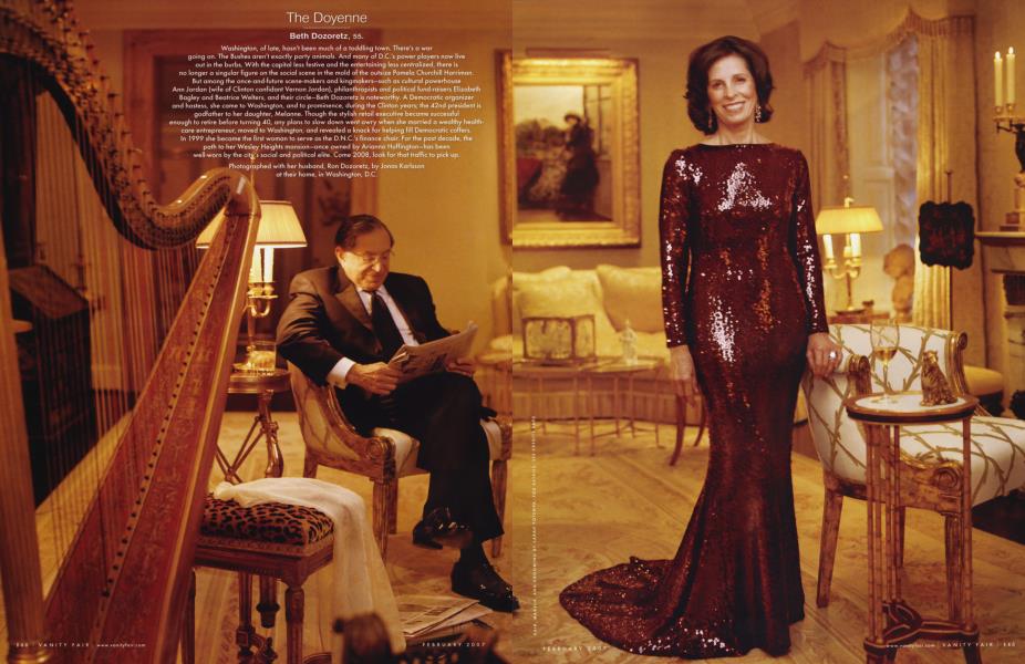 Washington, of late, hasn't been much of a toddling town. There's a war going on. The Bushes aren't exactly party animals. And many of D.C.'s power players now live out in the burbs. With the capital less festive and the entertaining less centralized, there is no longer a singular figure on the social scene in the mold of the outsize Pamela Churchill Harriman. But among the once-and-future scene-makers and kingmakers-such as cultural powerhouse Ann Jordan (wife of Clinton confidant Vernon Jordan), philanthropists and political fund-raisers Elizabeth Bagley and Beatrice Welters, and their circle—Beth Dozoretz is noteworthy. A Democratic organizer and hostess, she came to Washington, and to prominence, during the Clinton years; the 42nd president is godfather to her daughter, Melanne. Though the stylish retail executive became successful enough to retire before turning 40, any plans to slow down went awry when she married a wealthy health core entrepreneur, moved to Washington, and revealed a knock for helping fill Democratic coffers. In 1999 she became the first woman to serve as the D.N.C.'s finance chair. For the post decade, the path to her Wesley Heights mansion—once owned by Arianna Huffington—has been well-worn by the city's social and political elite. Come 2008, look for that traffic to pick up.