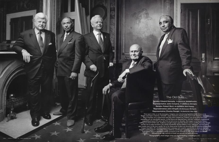 Once upon a time, or so the story goes, Congress was a functioning legislative body whose unruly fringes were kept in check by "old bulls"—senior statesmen of both parties and in both chambers who knew how to hammer out a compromise when the nation needed one. If there's any group alive that could exemplify such an improbable species, it is the Democrats depicted here, with their combined congressional experience of some 220 years. Byrd has served across six decades—the longest run in Senate history—casting more than 17,700 votes. A phalanx of right-wingers spent the election season painting Kennedy, Rangel, and the rest as pinko has-beens who would immediately declare defeat in Iraq, raise taxes, and start letting gay couples marry in the town square. But so far these power brokers are showing signs of bipartisan pragmatism: Conyers has sworn off a divisive impeachment campaign and vowed to concentrate on electoral oversight; Dingell is pushing popular alternative-energy initiatives; and Rangel is promising bipartisan tax reform. That's as it should be. To prove that they're worthy successors to the old bulls of yore, these veteran arm-twisters will have to use their seniority to break new ground, not settle old scores.