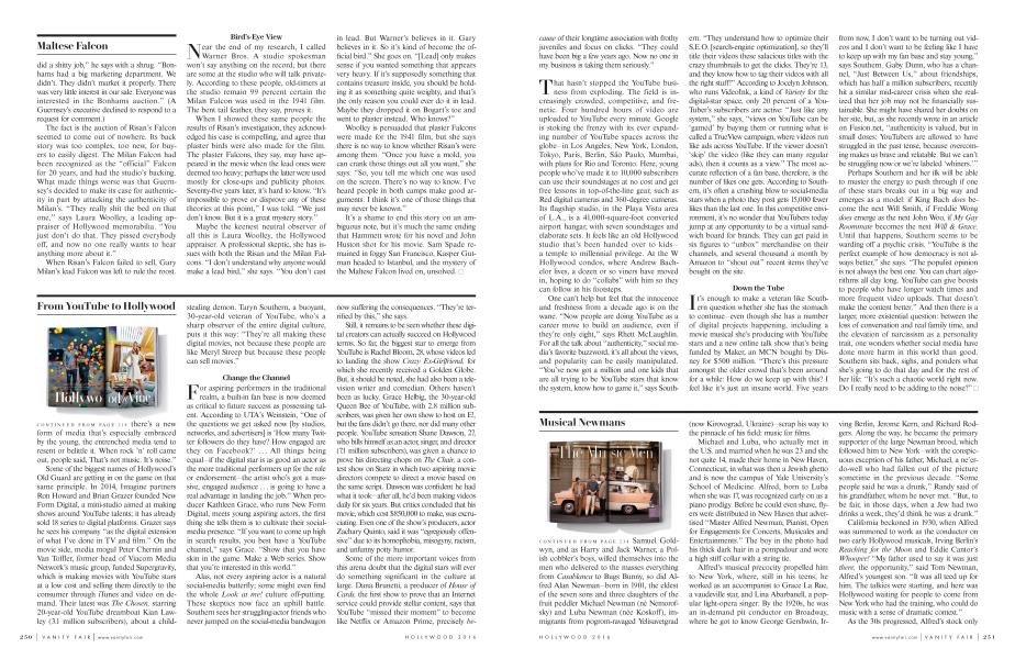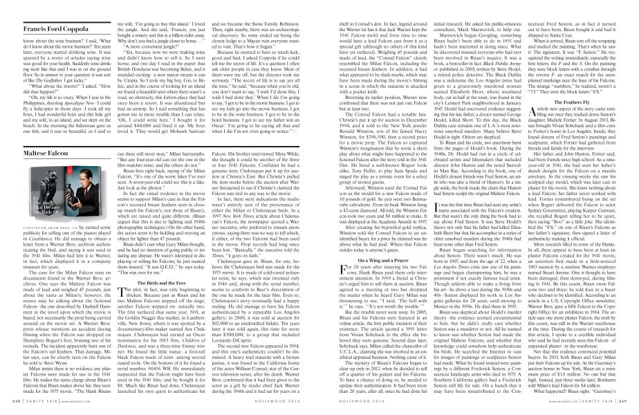 Hollywood 2016 Bryan BurroughIn the 1941 Humphrey Bogart classic, the Maltese Falcon was a prize beyond measure. A prop statuette from the film has been almost as eagerly sought—hotel and casino billionaire Steve Wynn paid $4.1 million at a 2013 auction for the iconic piece of movie memorabilia. But was it the genuine article? Probing the mystery, BRYAN BURROUGH tracks down a flock of Falcons, with links to both Leonardo DiCaprio and a famous Hollywood unsolved murder