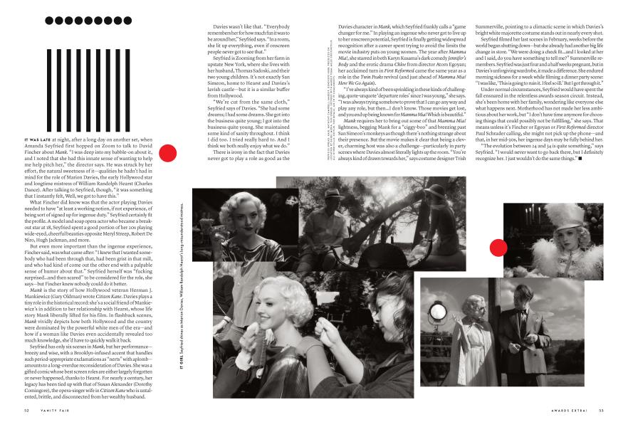Awards Extra Oscars Edition 1 2021 KATEY RICH GILLIAN LAUB NICOLE CHAPOTEAUIT WAS LATE at night, after a long day on another set, when Amanda Seyfried first hopped on Zoom to talk to David Fincher about Mank. “I was deep into my babble-on about it, and I noted that she had this innate sense of wanting to help me help pitch her,” the director says. He was struck by her effort, the natural sweetness of it—qualities he hadn’t had in mind for the role of Marion Davies, the early Hollywood star and longtime mistress of William Randolph Hearst (Charles Dance). After talking to Seyfried, though, “it was something that I instantly felt, Well, we got to have this.”