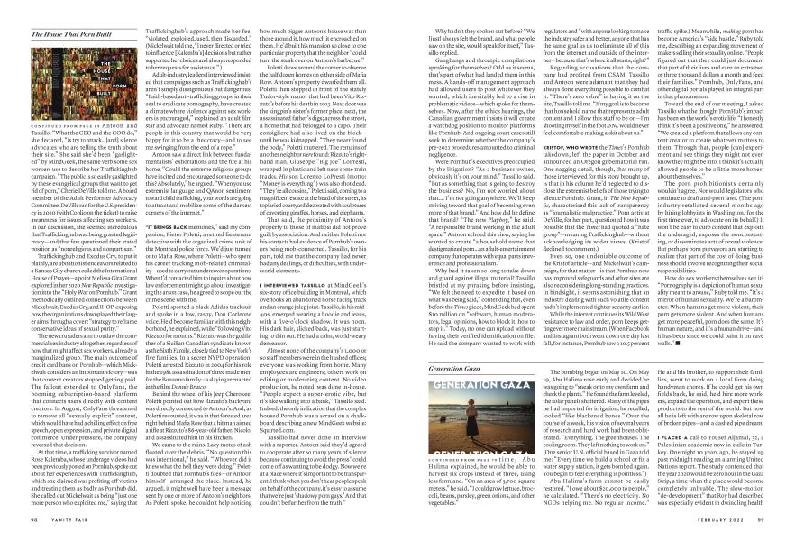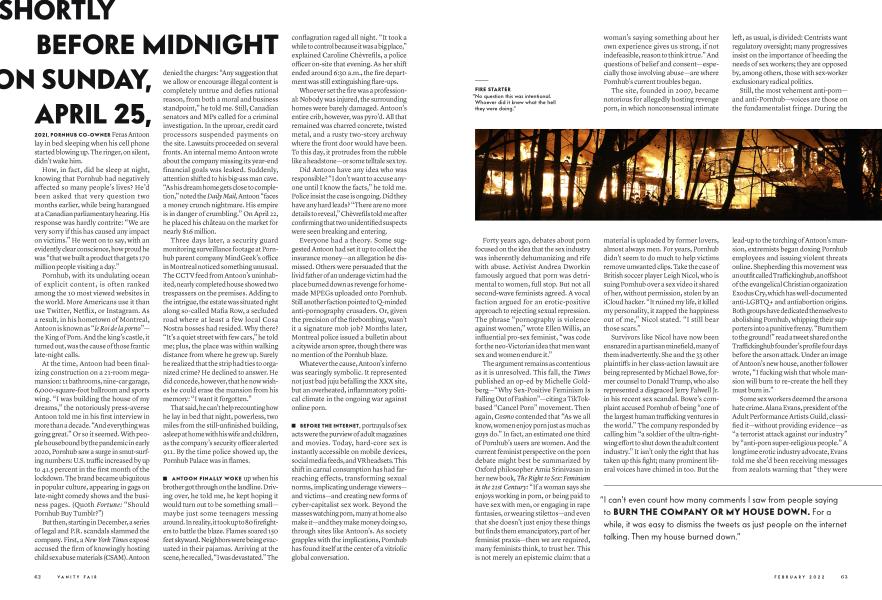 February 2022 ADAM LEITH GOLLNER JONATHAN HARRISWho torched the CEO of Pornhub’s mega-mansion? ADAM LEITH GOLLNER investigates a case of arson with no shortage of possible suspects, and the adult site’s shadowy founders—under fire from activists, evangelicals, and victims of revenge porn—break their silence