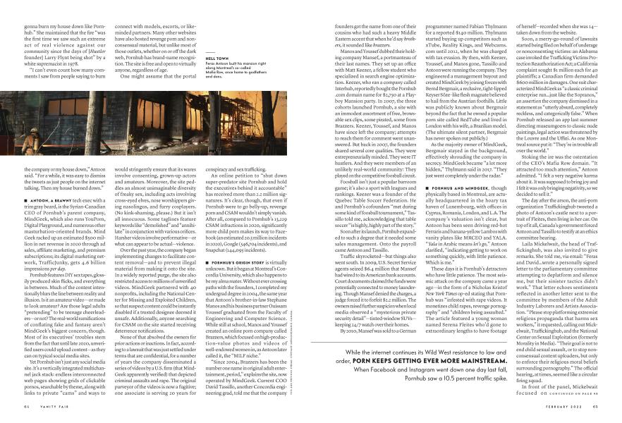 ANTOON, A BRAWNY tech exec with a trim gray beard, is the Syrian-Canadian CEO of Pornhub's parent company, MindGeek, which also runs YouPorn, Digital Playground, and numerous other masturbation-oriented brands. Mind Geek racked up an estimated $500 million in net revenue in 2020 through ad sales, affiliate marketing, and premium subscriptions; its digital marketing network, Trafficjunky, gets 4.6 billion impressions per day.